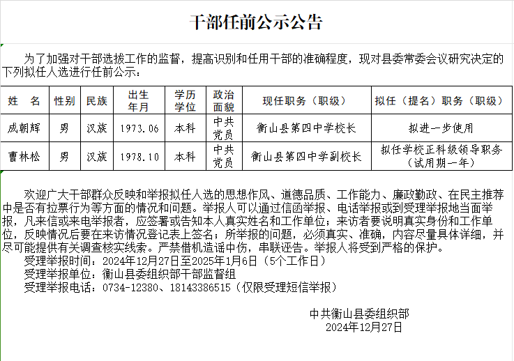 幹部任前公示公告 (2024年12月27日)