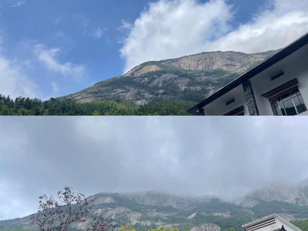 圖為晴天與霧天雷缽峰景色對比