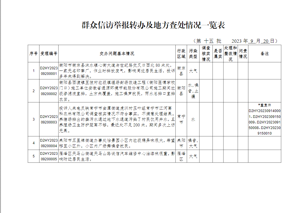 群眾信訪舉報轉辦及地方查處情況一覽表(第十五批)