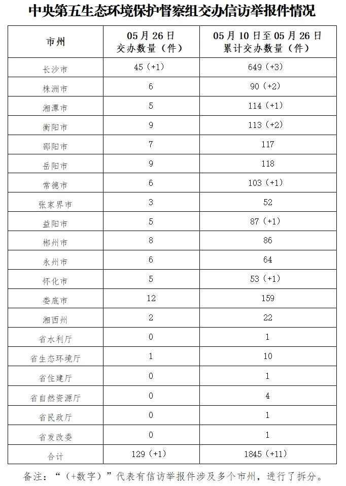 中央第五生態環境保護督察組今天向湖南交辦群眾信訪舉報件129件(來電舉報58件,來信舉報71件),其中重點件16件。我省分解後交辦130件,其中重點件16件。