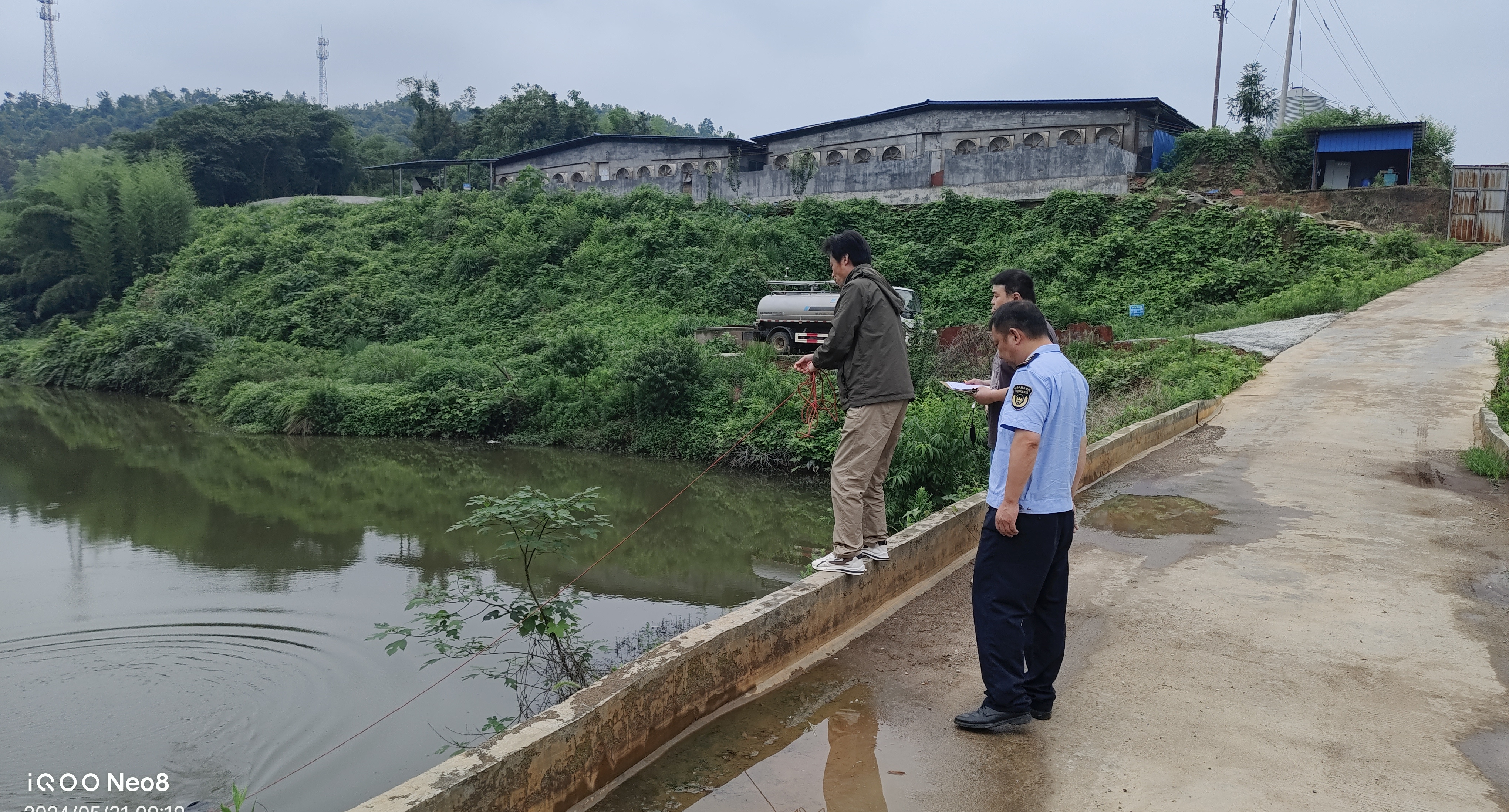 經核實,該養殖場建有豬舍2棟,麵積約2400平方米,設計年出欄生豬規模4000頭。目前,該2棟豬舍內於2024年5月25日進苗豬仔2200頭。豬舍風機口未安裝除臭裝置,周邊臭氣明顯;清潔生產不到位,部分物品亂堆亂放,周邊雜草叢生,蚊蟲較多,現場檢查未發現設置有廢水排放口。同時,衡山生態環境監測站對該養殖場周邊水塘地表水進行采樣監測。