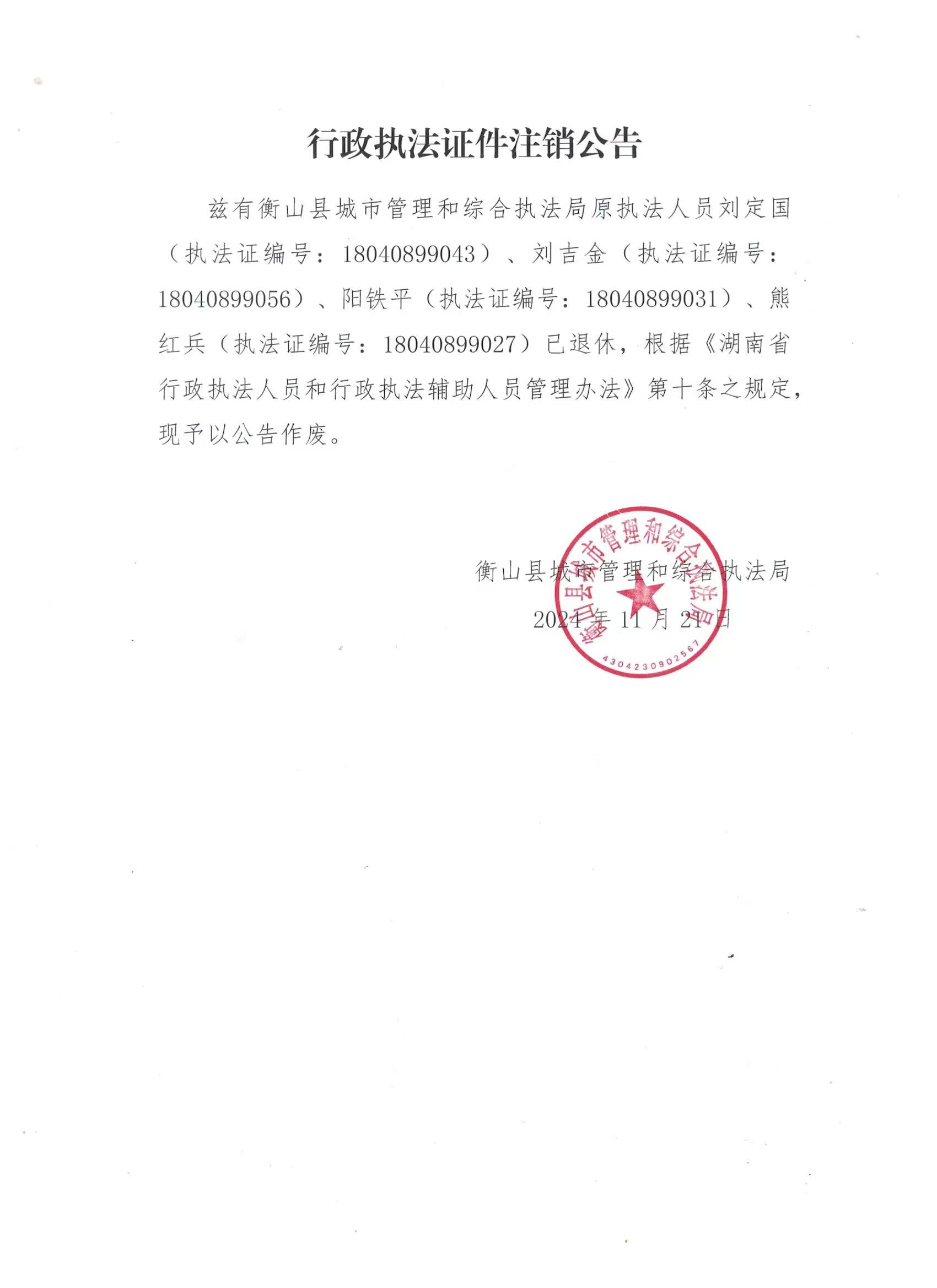 關於劉定國等四名同誌行政執法證件注銷的公告