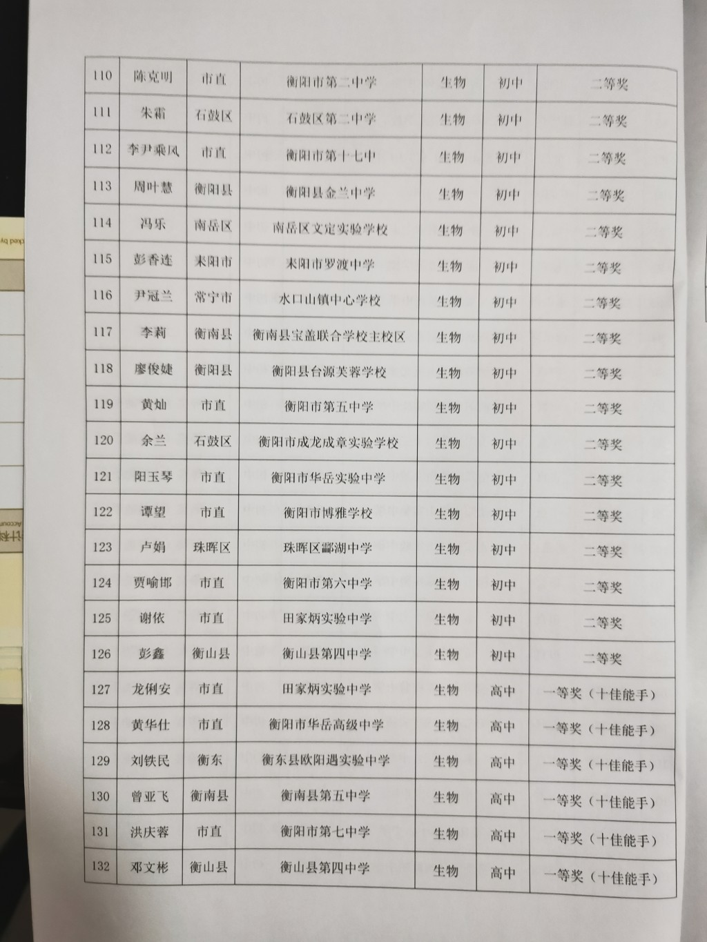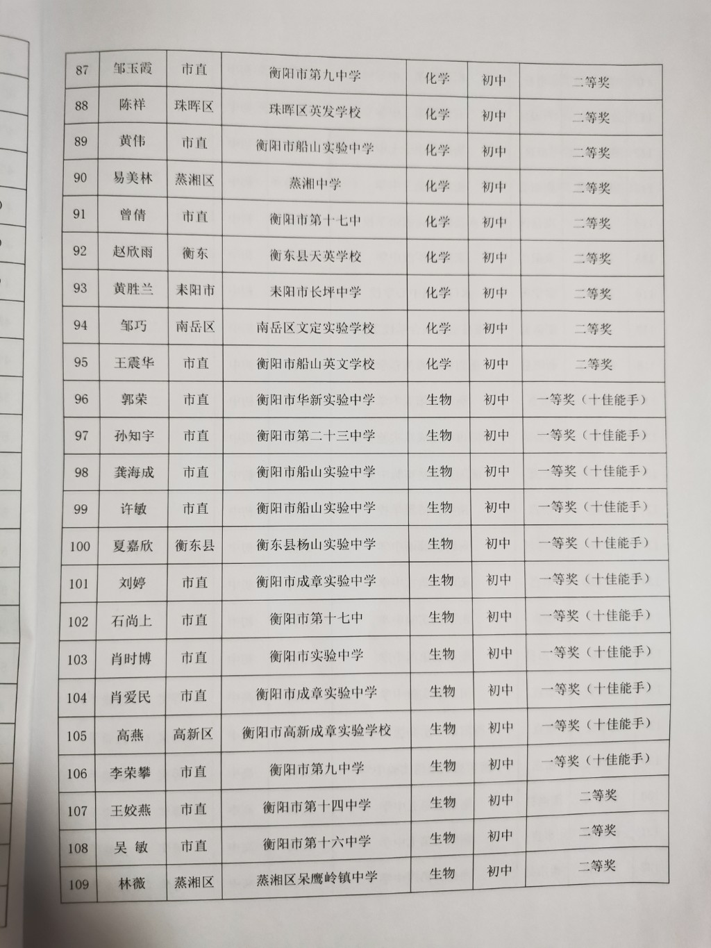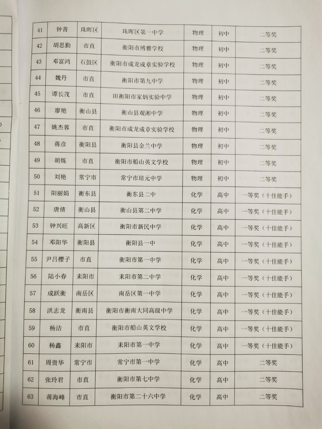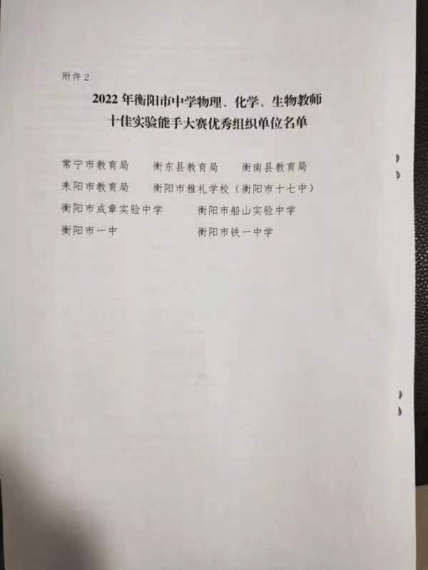 關於2022年衡陽市中學物理、化學、生物教師十佳實驗能手大賽結果的通報