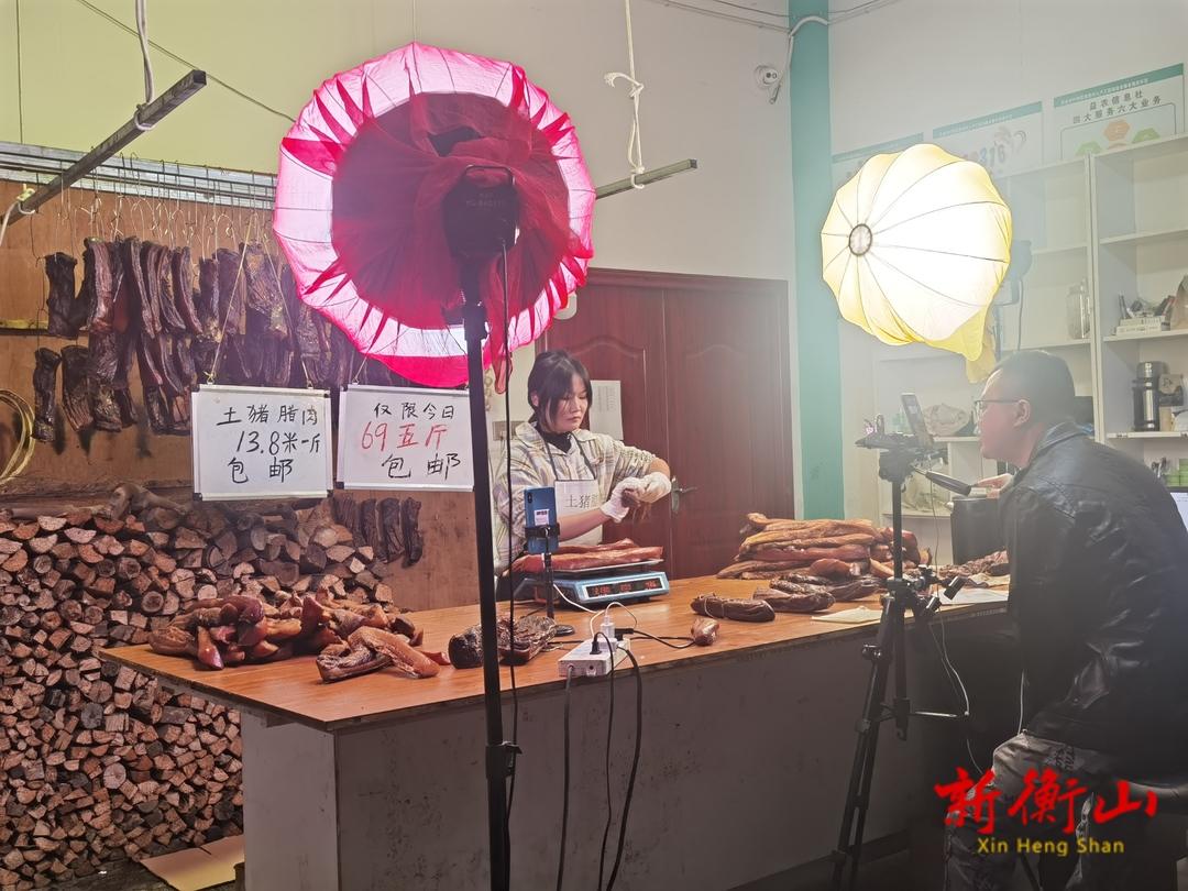 11月17日,在我縣電子商務公共服務中心,湖南湘宏食品股份有限公司的專業團隊正在直播帶貨,向直播間的網友們介紹企業加工生產的臘肉,這裏也是湘宏食品的運營中心。
