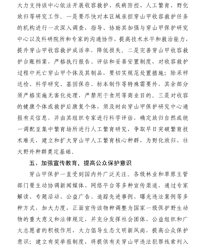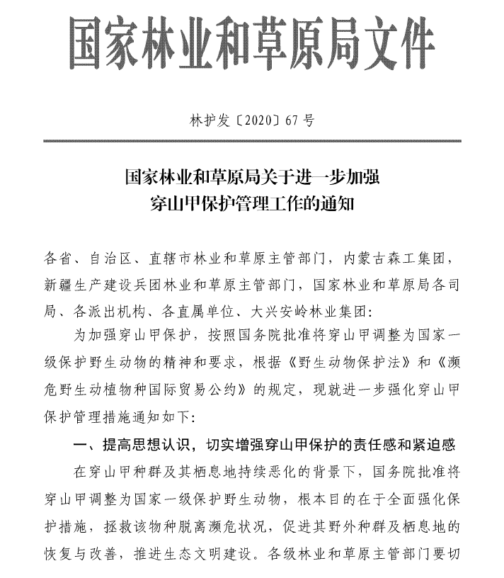 國家林業和草原局關於進一步加強穿山甲保護管理工作的通知