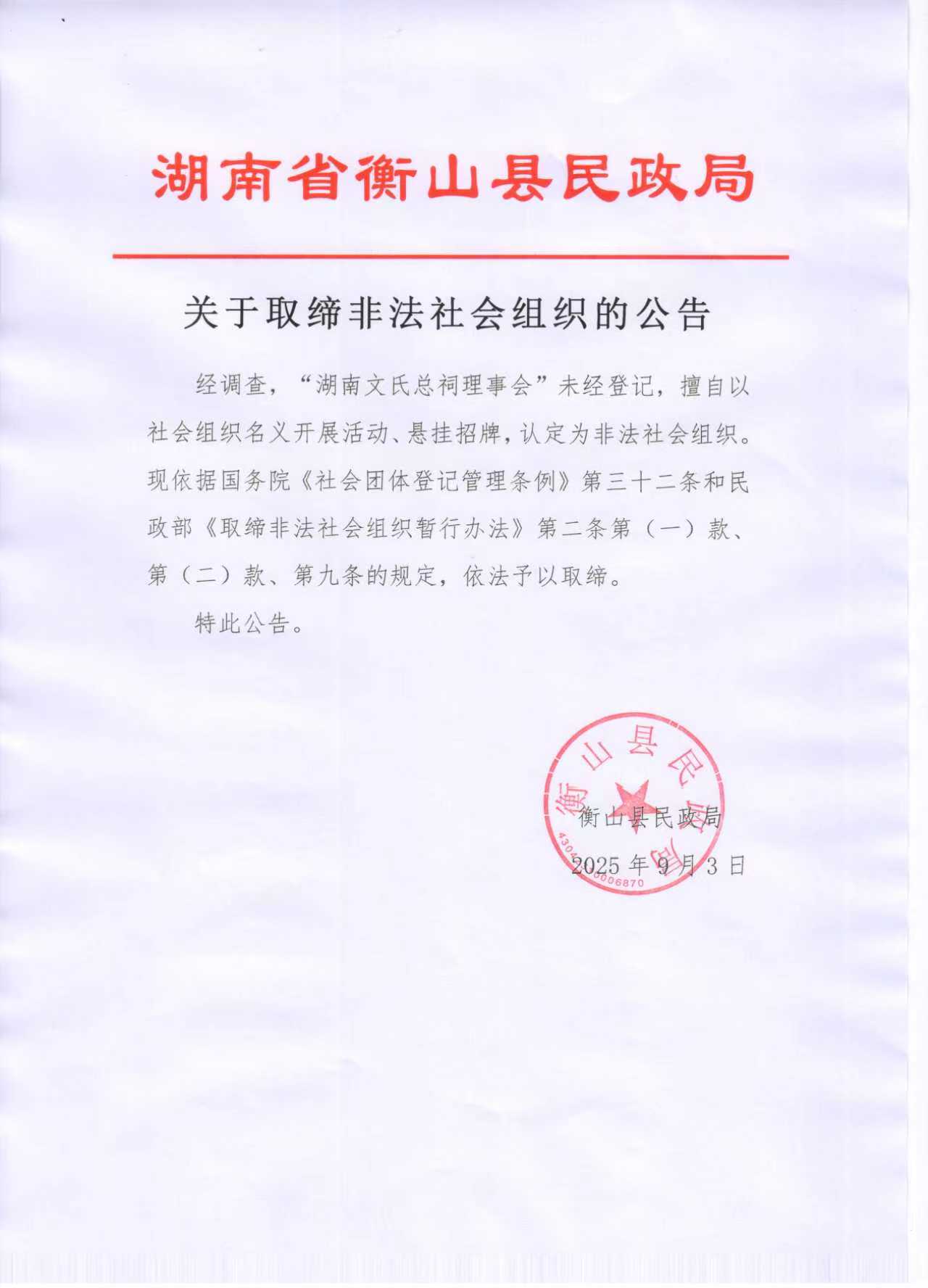 關於取締非法社會組織的公告(湖南文氏總祠理事會)