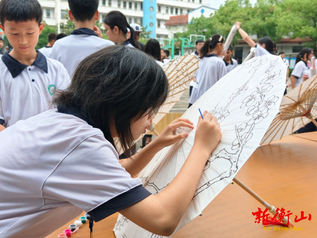 隨後,一場“指尖上的傳承”正式開始。粽編區清香彌漫,傳承人們耐心引導學生編織粽葉,青綠粽葉魔術般化作振翅的蜻蜓;油紙傘繪製區水彩淋漓,學生們恣意塗鴉,朵朵山茶在素白傘麵漸次綻放;鉤針區銀針穿梭,學生們專注地鉤出第一朵立體小花;二胡及葫蘆絲演奏區內,孩子們在傳承人的指引下演奏自己喜歡的歌曲,歌聲婉轉清亮……衡山本土的文化基因正悄然融入學生們的文明血脈,古老的智慧與青春朝氣在此刻交融共生。