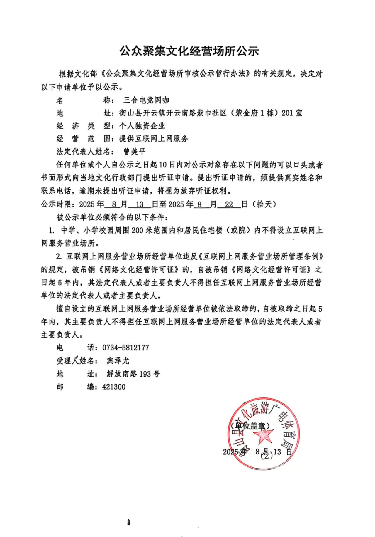 公眾聚集文化經營場所公示
