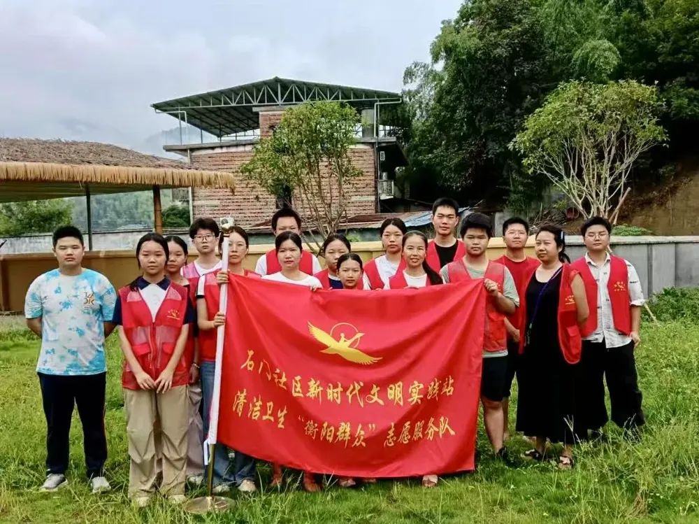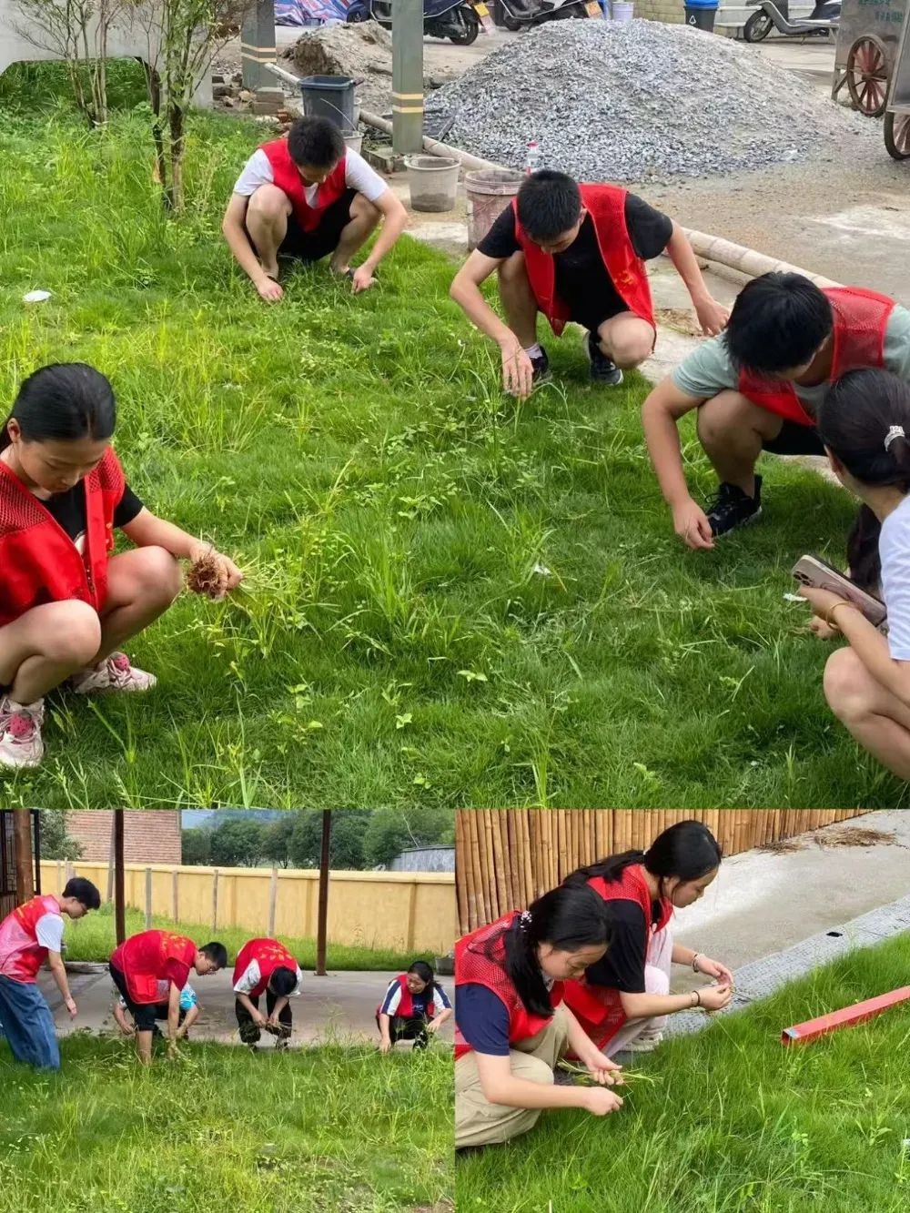 石門社區鄉間院落旁,一片公共綠地因夏日雨水瘋長雜草。誌願者們身著紅馬甲分散開來:男生攥緊草莖發力,將深紮土中的雜草連根拔起;女生蹲身分揀草間碎紙、空瓶,不讓垃圾藏身。遠處茅草棚的陰影隨日光移動,他們的汗珠滾落草葉——“這兒有玻璃渣!”“這片草根纏成窩了!”的提醒聲裏,雜亂綠地漸漸露出鮮嫩底色,與背景錯落的民居、朦朧山影相映,勾勒出鄉村最質樸的清爽。