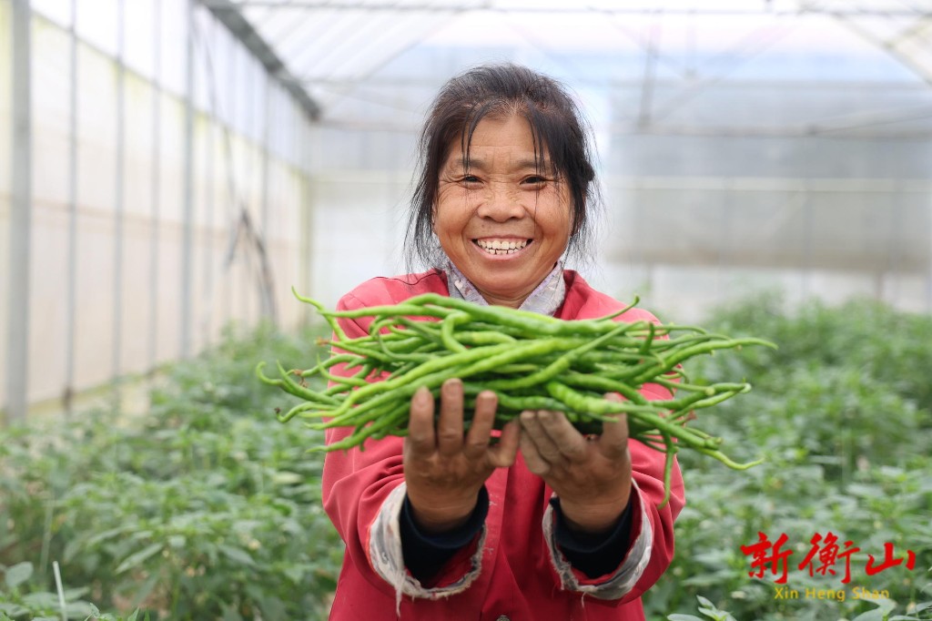 近日,衡山縣長江鎮石橋鋪社區的敬安農業基地的秋延後辣椒大批量上市,進入集中采收期,大棚內一派忙碌景象。