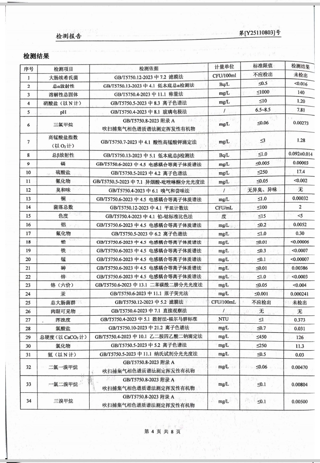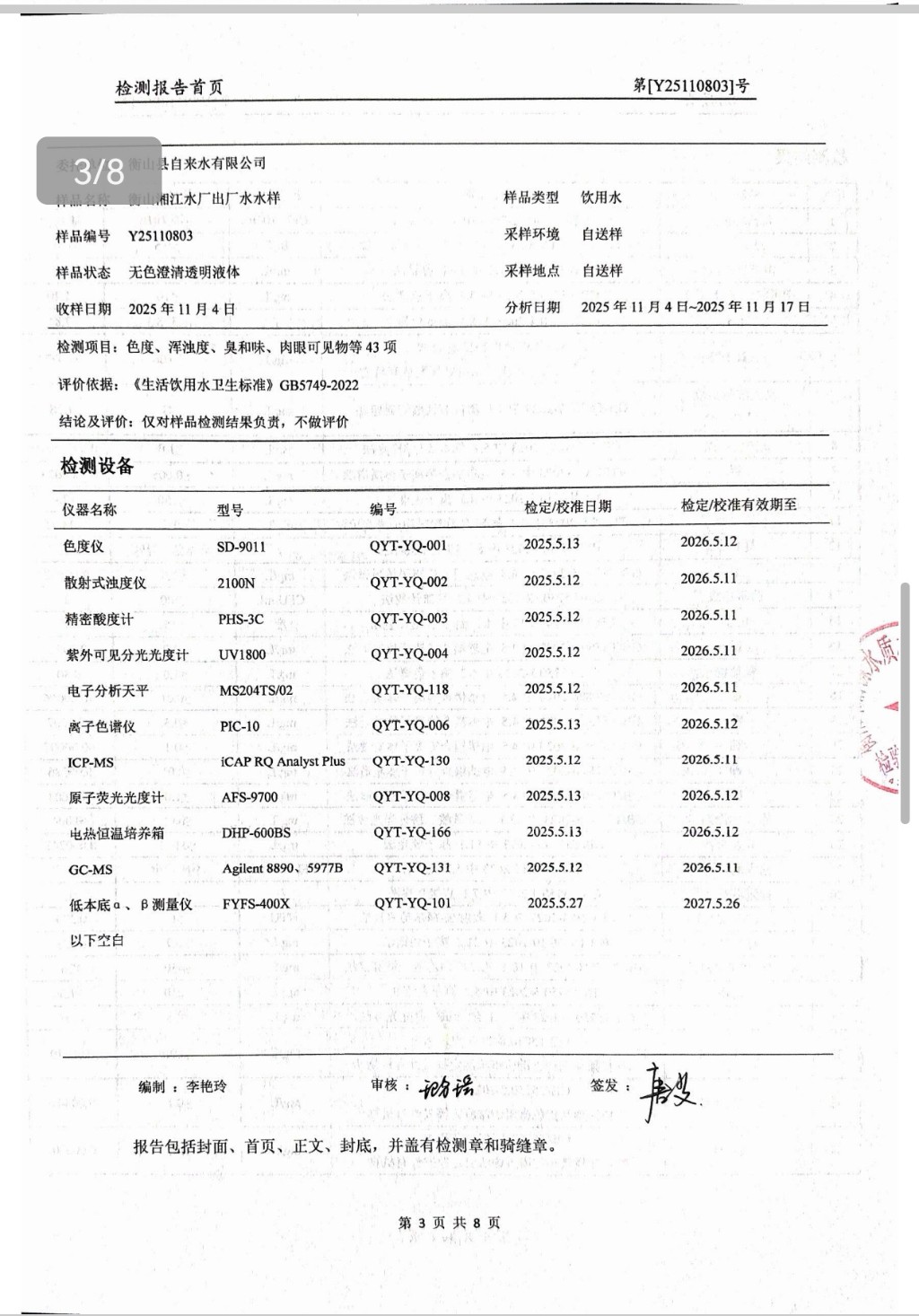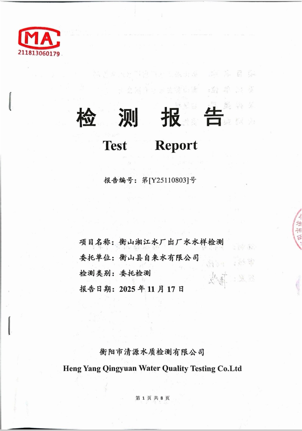 提高服務質量、保障供水安全(2025年11月水質檢測報告)