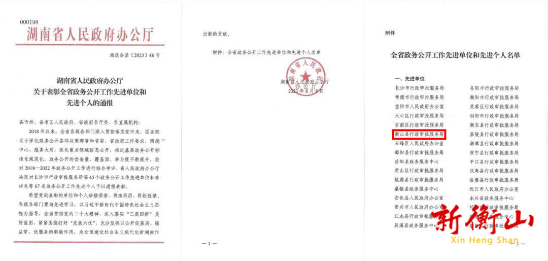 近日,湖南省人民政府辦公廳發布《關於表彰全省政務公開工作先進單位和先進個人的通報》,對2018年-2022年政務公開工作綜合考評優秀的單位和個人進行通報表彰,衡山縣行政審批服務局在此次五年一度的評選中榮獲全省"政務公開工作先進單位"榮譽稱號。